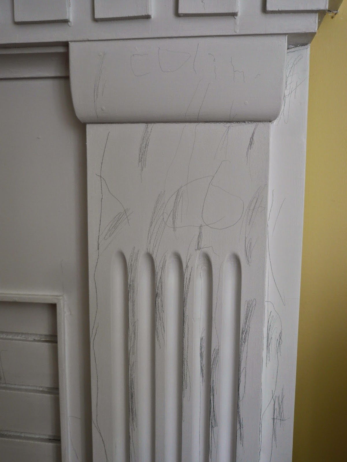 There is art over the mantle, and then there is art on the mantle. This appeared around our fireplace at some point over the last week. Myriam noticed it first, and wondered aloud about the identity of the artist. "It was Colin," Evelyn informed her. "How do you know that?" Myriam replied, somewhat suspiciously - assigning blame is an Olympic sport around here. "He signed it", she stated. Sure enough, there was his proud signature crowning the right-hand column. I'm relieved that Colin prefers to work in pencil and crayon, and not paint or permanent marker....